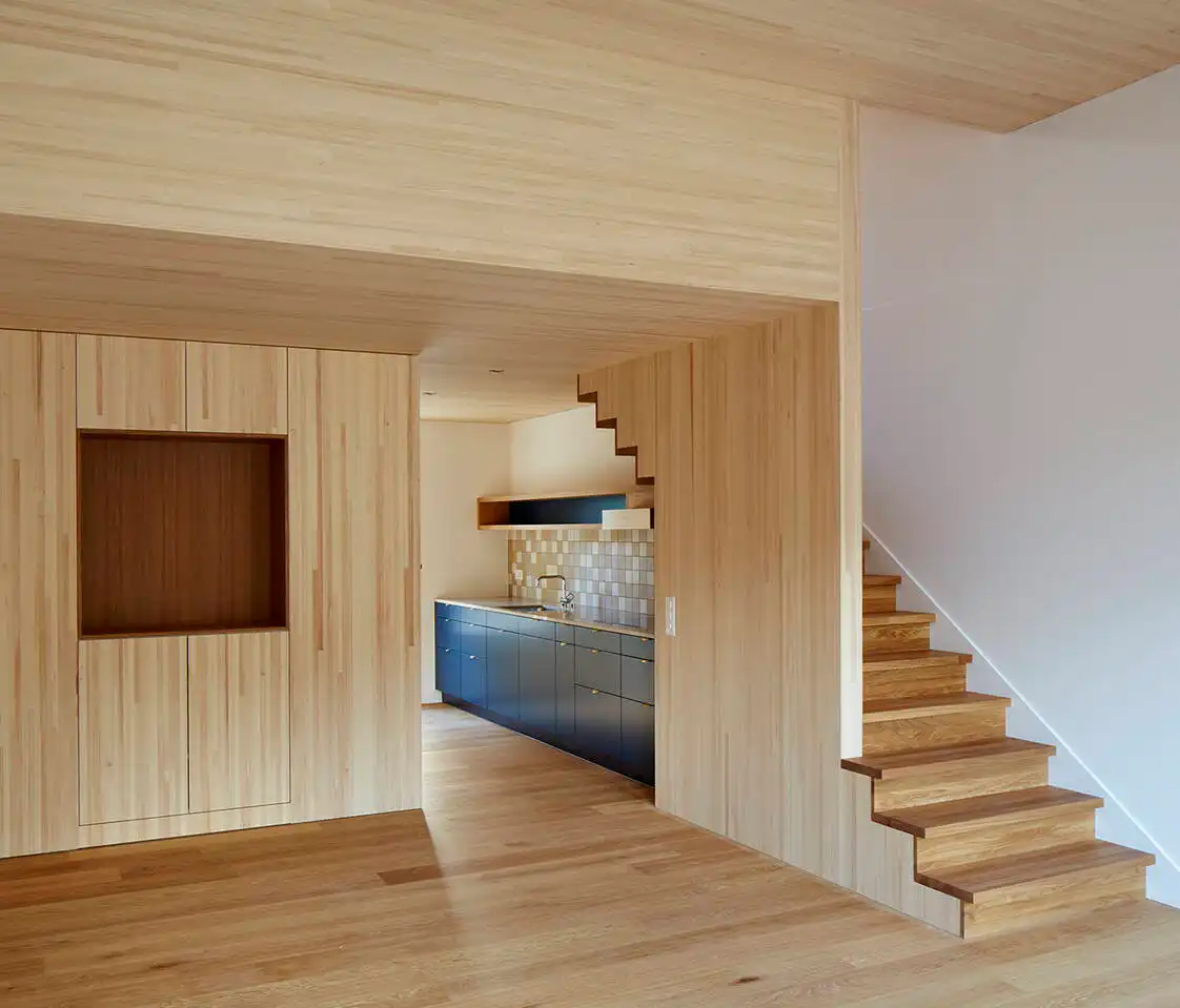 Die begrenzte Grundfläche wird optimal genutzt, so trennt eine Holzbox im EG mit WC, Garderobe, Küche und Kellertreppe den Eingangsbereich vom Wohnen. Die Treppe ins Obergeschoss hat nebst ihrer Funktion auch einen gestalterischen Aspekt und ist entsprechend sehr präsent in der dunkelblauen Küche integriert.